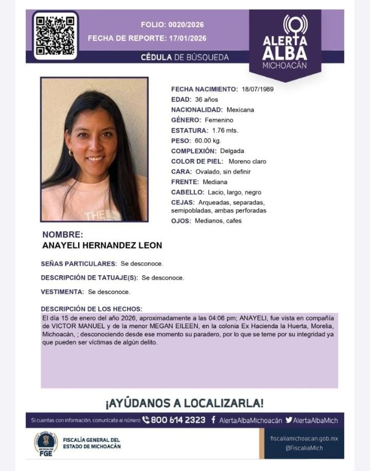 La intérprete de señas, quien trabajaba para el gobierno, Anayeli Hernandez fue encontrada junto con su esposo, Victor Manuel, y su hija de 12 años, Megan Eileen, asesinados y calcinados, además de mostrar señales de tortura, tras que fueran reportados como desaparecidos y se lanzara una alerta amber en Michoacán.
