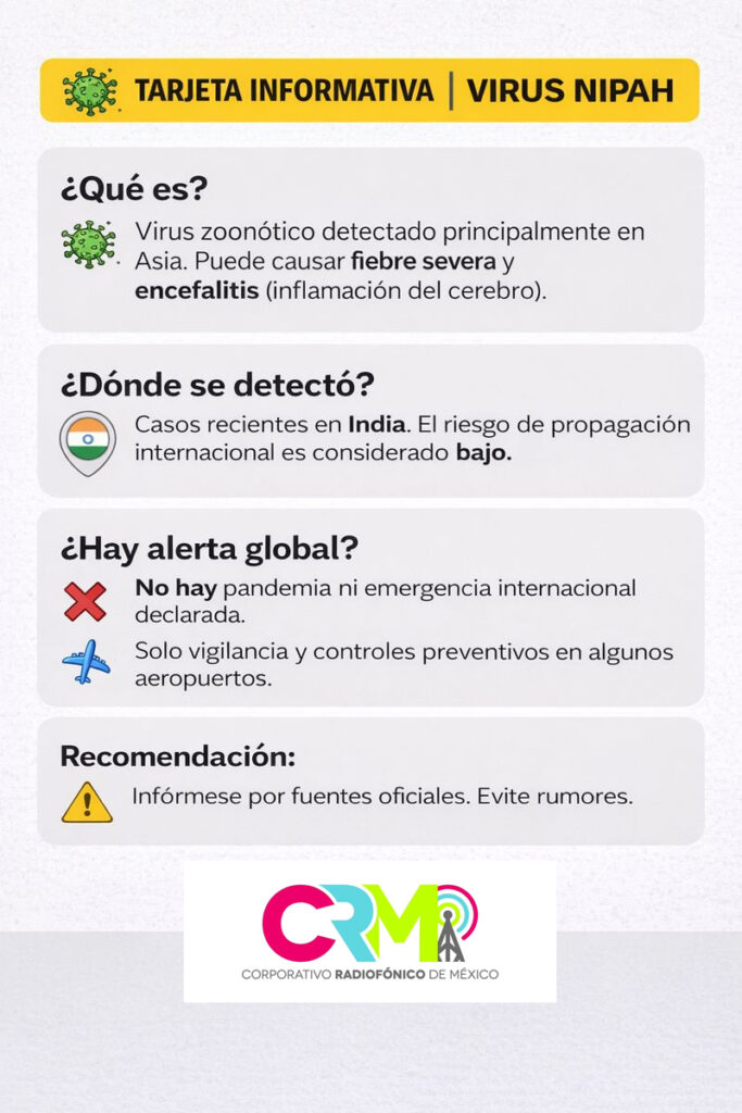 Autoridades sanitarias internacionales mantienen vigilancia epidemiológica tras detectarse casos del virus Nipah en la India, un patógeno poco común que puede provocar complicaciones neurológicas graves. Hasta el momento, no existe una alerta sanitaria generalizada ni cierre de fronteras, y el riesgo de propagación internacional es considerado bajo. Algunos países han reforzado medidas preventivas en aeropuertos, […]