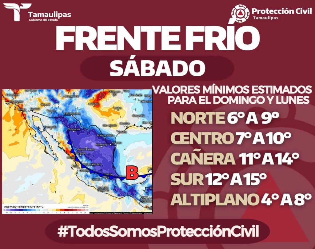 Durante el sábado, un nuevo frente frío cruzará Tamaulipas; probabilidad de lloviznas y lluvias ligeras dispersas, evento “Norte” con ráfagas de viento entre los 55 a 75 km/h y descenso moderado de temperaturas.