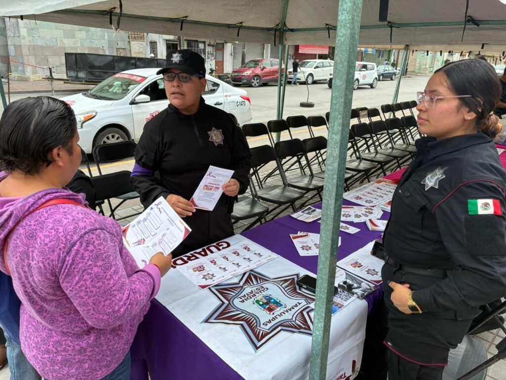 Matamoros, Tamaulipas.- Atendiendo las instrucciones del gobernador, Américo Villarreal Anaya, de intensificar las acciones para prevenir la violencia en el núcleo familiar, personal de la Guardia Estatal de Género trabaja en una campaña preventiva en espacios públicos.